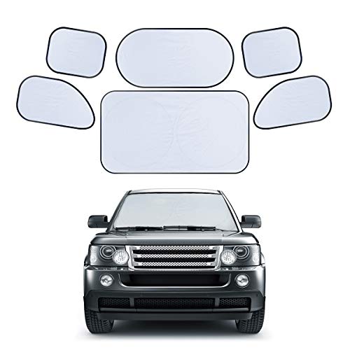 - Universal Fit: 6 x car Windshield Sunshades (1x windshield sunshade,4 x Side window sunshade, 1x Rear window sunshade) fits most standard cars, sedans, Mid -Size SUVs and Trucks. Not only blocking the sun in front of the windshield but also blocking the side and the sun behind it, 100% comprehensive protection. The Size of windshield sunshade: L x W :63 x 35″, Ring Diameter = 33″. Fits with windshields by measurement of 58-63 x 33-35″