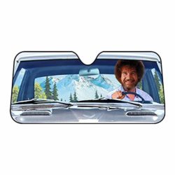 Sitting behind the steering wheel of the car interior featured on this amazing sun shade is Bob Ross, the world’s favorite art instructor. The view from his back window