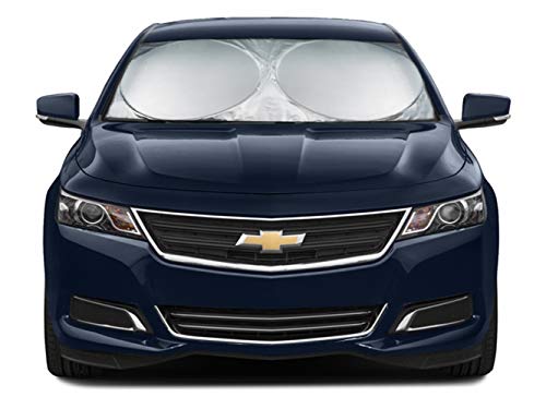 LARGE SIZE WINDSHIELD SUNSHADE is easy to use. Fits Perfectly to most Full Size Cars, Trucks and Vans. (Please check the “Size Chart” in the images section above.) It keeps your car interior cool even on the hottest days. No more getting into a steaming car that makes you sweaty and uncomfortable. PROTECTS CAR INTERIOR from harmful UV rays and heat that will fade dash and seats. Saves your upholstery from cracks and splits. Also protects you from being burned when you sit in a super hot car while wearing shorts. AIR CONDITIONER WORKS FASTER & EASIER using less energy and gas. Instead of having to wait 15 minutes for your AC to cool off your car, the AC cools faster & easier. Saves you money while making your drive much more comfortable and enjoyable. STEERING WHEEL COVER SUNSHADE is included in this value packed set at no extra cost. It keeps your wheel from being hot and burning your hands. Also protects steering wheel material from fading and cracking. COMES WITH A COMPACT POUCH. When you’re done, the shade folds up small and fits into the included bag. Easily store under the seat or in the trunk. Try this sunshade and you will never want another.